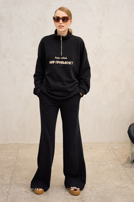 Комплект выполнен из трикотажного полотна. Кофта свободного кроя, прямого силуэта. Линия плеча спущена, рукав длинный, по низу рукава резинка. По горловине воротник-стойка на застежку молнию. По переду горизонтальная кокетка, по центру печать, по низу регулируемая резинка на фиксаторы. Брюки прямого силуэта, на резинке. В боковых швах прорезные карманы.