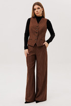 Костюм брючный, выполнен из плательно-костюмной ткани. Жакет полуприлегающего силуэта на подкладке, застежка на одну петлю и пуговицу. Рукав втачной длинный, по шву разрезы. На шлице рукава пуговица. Воротник стойка. Низ борта закругленный. По бокам прорезные карманы в рамку. По спинке средний шов, переходящий в отлетную шлицу, и рельефы. Брюки на притачном поясе с резинкой по спинке, застёжка на молнию и петлю-пуговицу. В боковых швах прорезные карманы. Брюки свободного кроя, прямого силуэта, на притачном поясе. По переду глубокие складки, в боковых швах прорезные карманы. По задней половине брюк талевые вытачки.
