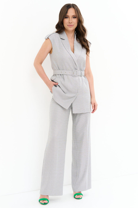 Элегантный комплект из  удлиненного жилета и широких стильных брюк. Комплект выполнен из мягкой костюмной ткани. Однобортный жилет полуприлегающего силуэта с отложным воротником, на подкладке,  с центральной застежкой на пришивные  потайные кнопки.  Воротник отложной. Жилет дополнен удобными карманами.  Притален за счет съемного пояса, выполненного из основной ткани (в комплекте). Широкие брюки прямого кроя с притачным поясом, с застежкой на пришивную пуговицу и молнию. Посадка слегка завышена. Дополнены функциональными боковыми карманами.Длина жилета от плечевого шва 87 см. Длина брюк по боковому шву 109 см