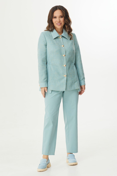 Стильный и элегантный комплект из жакета и брюк. Жакет прямого кроя, на подкладке, с центральной застежкой на пришивные пуговицы. Выполнен из джинсовой ткани в сочетании с рогожкой. Рукав втачной, снизу дополнен притачной манжетой с застежкой на пришивную пуговицу. Воротник отложной. По талии скрытая кулиска с фиксаторами. Брюки свободного кроя, слегка заужены книзу. Посадка средняя. Пояс притачной, дополнен эластичной тесьмой. Брюки дополнены удобными боковыми карманами. Застежка гульфик на молнию и металлическую пуговицу. Брюки выполнены из джинсовой ткани средней плотности. Длина жакета от плечевого шва 75см. Длина рукава 60см. Длина брюк по боковому шву 98 см.
