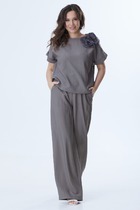 Элегантный комплект из блузы и брюк, выполненных из комфортной поливискозной ткани. Блуза свободного кроя с коротким цельнокроеным рукавом, дополненным отложной манжетой. Горловина округлой формы, с левой стороны дополнена декоративным несъёмным элементом из нежного шифона. По низу спинки для придания легкого объема блуза дополнена эластичной тесьмой. Брюки свободного  прямого кроя. Посадка средняя. Пояс притачной, дополнен эластичной тесьмой. Брюки дополнены удобными боковыми карманами. Застежка-гульфик на молнию и пуговицу. Длина блузы от плечевого шва 62см. Длина рукава 23см. Длина брюк по боковому шву 108см.