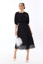 Стильный трикотажный костюм из джемпера и юбки. Джемпер свободного кроя со спущенным рукавом, дополненным притачной манжетой с застежкой на пришивную пуговицу. Горловина округлой формы, обработана довязом. Перед джемпера выполнен из мягкого трикотажного полотна с леопардовым принтом. Спинка и рукава выполнены из фактурного трикотажного полотна (рубчик). Юбка миди прямого кроя, на подкладке, с притачным поясом, дополненным эластичной тесьмой. Выполнена из фактурного трикотажного полотна (рубчик) Юбка дополнена боковым разрезом. Длина джемпера от плечевого шва 60см. Длина рукава 60см. Длина юбки 83см.