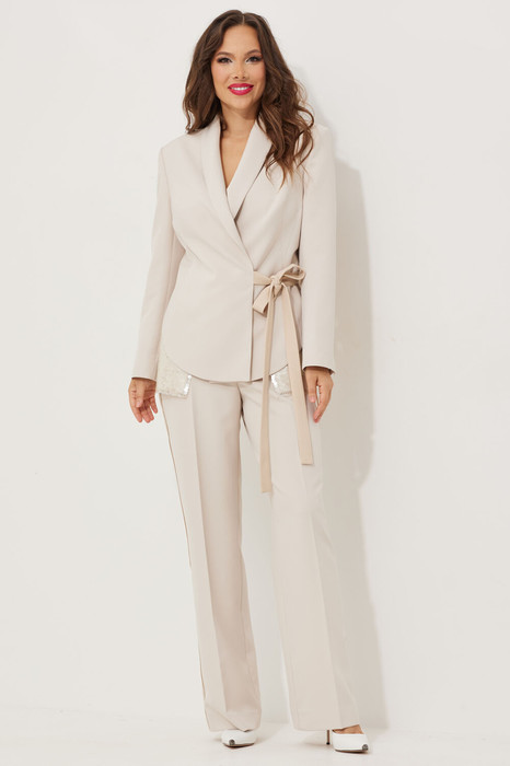 Стильный и элегантный комплект из жакета и брюк. Жакет полуприлегающего силуэта, на подкладке, с центральной застежкой на потайные кнопки. Так же жакет дополнен пришивным поясом. Рукав втачной. Воротник отложной. Спинка и отделочные элементы жакета и брюк выполнены из слегка мерцающей поливискозной ткани, что придает комплекту неповторимый шарм. Так же жакет дополнен вставками из сетки с мерцающими пайетками. Брюки классического прямого кроя с притачным поясом, дополненным эластичной тесьмой. Застежка гульфик на молнию и пришивную пуговицу. По боковому шву, брюки дополнены пришивным элементом, выполненными из слегка мерцающей поливискозной ткани. Длина жакета от плечевого шва 70 см. Длина рукава 60 см. Длина брюк по боковому шву 107 см