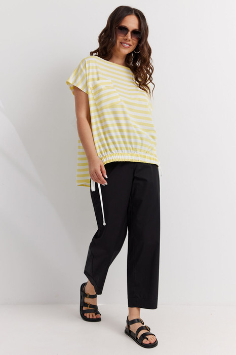 Стильный комплект из трикотажной футболки и брюк. Футболка свободного кроя с коротким цельнокроеным рукавом. Выполнена из трикотажного полотна в стильную полоску. Для придания объема спереди по низу футболка дополнена скрытой кулиской на шнурке. Брюки свободного прямого кроя со слегка зауженным низом. Притачной пояс дополнен эластичной тесьмой. Застежка гульфик на молнию и пришивную пуговицу. По бокам расположены удобные карманы. Длина футболки от плечевого шва спереди 60см. Длина по спинке 70см. Длина рукава 15см. Длина брюк по боковому шву 92 см.