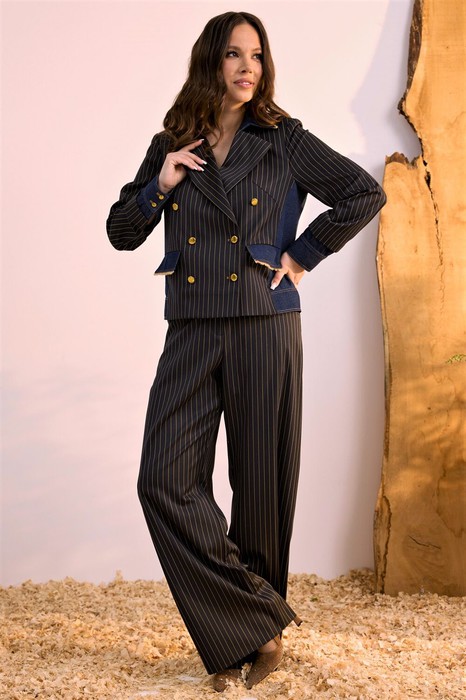 Стильный компект из жакета и брюк. Двубортный жакет выполнен из костюмной ткани в комбинации с темно-синим джинсом. Жакет на подкладке с застежкой на пришивные пуговицы. Рукав втачной, дополнен манжетой из джинса. Воротник отложной. Брюки классического прямого кроя с притачным поясом, выполненным из джинса, дополненным эластичной тесьмой. Посадка средняя. Дополнены удобными боковыми карманами. Застежка гульфик на молнию и пришивную пуговицу. Брюки выполнены из комфортной костюмной ткани. Длина жакета от плечевого шва 58см. Длина рукава 60см. Длина брюк по боковому шву 104см.