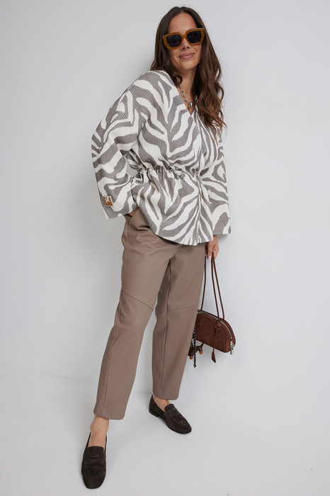 Стильный комплект из жакета-кимоно и брюк из мягкой и комфортной эко кожи. Двубортный жакет свободного кроя over с застежкой на красивые пришивные пуговицы. По талии скрытая кулиска с эластичной тесьмой, за счет которой можно поменять образ и приталить жакет. Жакет на подкладке, выполнен из фактурой ткани с animal принтом.  Линия плеча слегка спущена. Рукав полной длины, широкий. Жакет дополнен удобными боковыми карманами. Брюки классического кроя , слегка заужены книзу. Притачной пояс дополнен эластичной тесьмой. Изнанка брюк выполнена из комфортной вискозы. Застежка гульфик на пришивную пуговицу и молнию. Брюки дополнены удобными карманами. Длина жакета от плечевого шва75см.  Длина рукава 60см.  Длина брюк по боковому шву 94см.