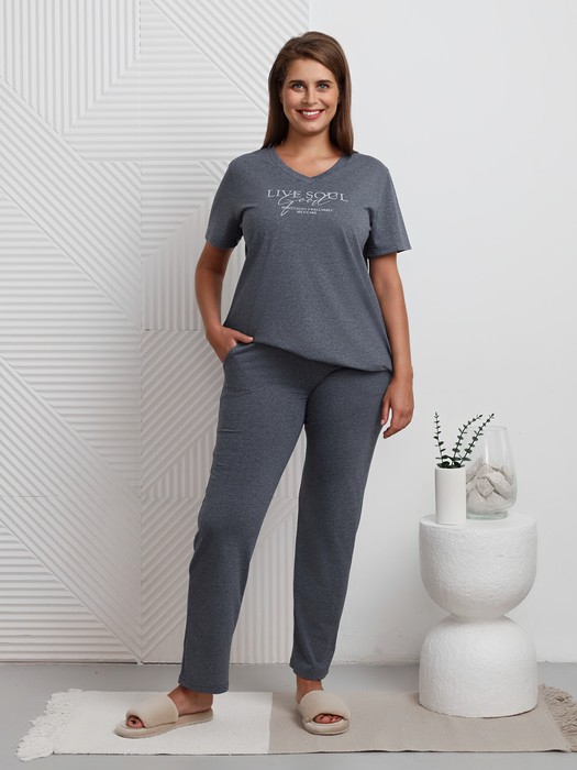 Костюм женский из трикотажного гладкокрашенного меланжированого полотна «кулирка», состоящий из футболки и брюк.Футболка - классического покроя, с короткими втачными рукавами, горловиной V- образной формы и принтом на полочке, выполненным в технике «шелкографии». Горловина обработана втачной планкой из основного материала.Брюки - свободного покроя, с карманами в боковых швах, на притачном поясе с эластичной тесьмой внутри.