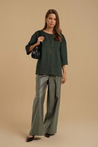 Модный и актуальный комплект из приятной ткани. Брюки-кюлоты с элегантным запахом, свободной посадки, брючины широкие укороченные, чуть выше щиколотки. По переду молния, сзади по поясу вставлена резинка, запах фиксируется поясом на карабин. Брюки-кюлоты выполнены из мягкой, приятной к телу средней плотности твидовой ткани. Блуза из трикотажа по переду украшена накладным карманом в цвет брюк. Блуза свободного кроя, рукав спущен, по бокам разрезы, благодаря чему ее с легкостью можно носить как навыпуск, так и заправленной. Такой комплект станет любимым в Вашем гардеробе — это воплощение стиля и комфорта. Оба изделия прекрасно сочетаются между собой и могут смело создавать дополнительные стильные комбинации с другими вещами, а также с любой по стилю обувью.
