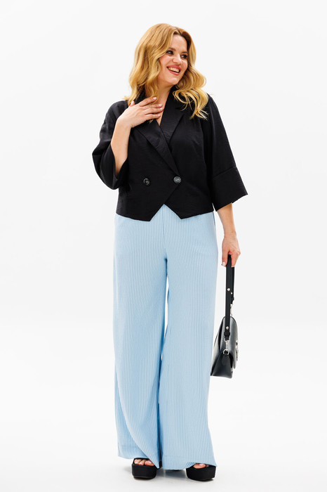 Стильный и удобный женский костюм выполнен из легкого вискозного материала. Изделие состоит из двух предметов: жакета и брюк-палаццо. Данный комплект отличный вариант для торжеств. Жакет свободного силуэта с двубортной застежкой по переду на петли-пуговицы, воротник с лацканами, плечо спущено, рукав 3/4. Перед жакета с подрезными бочками, спинка с центральным швом, расходящимся к низу швом-капелькой и притачным поясом-застежкой на пуговицу по низу. Брюки-палаццо идеально сидят на любой фигуре, подчеркивая все достоинства и скрывая недостатки. Брюки свободного кроя, длинные, на притачном поясе с резинкой. По переду два кармана в боковых швах. С данным комплектом можно смело создавать стильные образы как вместе, так и по отдельности. Длина жакета по спинке 49см +-1 см, длина рукава от горловины 37см ± 1см. Длина брюк по боковому шву 111см +-1см, по шаговому 81см +-1см. Изделие подойдет на рост 170 см.