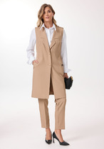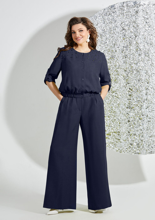 Стильный комплект, состоит из бомбера, майки и брюк. Майка выполнена из вискозы, хорошо тянется и приятная к телу. Горловина округлой формы, окантована, рукав укороченный. Бомбер выполнен из летней ткани, льна-вишера, имеет приятную фактуру, комфортен в ношении. Горловина округлой формы, на обтачке, застежка на кнопки, лиф изделия с отрезной кокеткой, декорированной бусинами. Также на полочке обработаны прорезные карманы с листочкой. Спинка свободного покроя, по низу изделие обработано планкой с резинкой. Рукав втачной, длинный, по низу на манжете, с декором в виде паты, застегивается на кнопку. Брюки-палаццо выполнены из льна-вишера, с застежкой на молнию, верхний срез обработан притачным поясом, с застежкой на пуговицу. На передних полотнищах обработаны карманы в боковых швах, по верху заложены односторонние складки. На заднем полотнище брюк обработаны вытачки, низ с широкой подгибкой. Стильный комплект с эффектным декором и фурнитурой, отличный выбор для летнего гардероба!