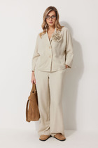 Костюм двухпредметный состоит из жакета и брюк.  Элегантный дизайн костюма  с брюками подарит комфорт и уверенность в себе. Жакет с центральной застежкой на 2 петли и пуговицы с прорезными функциональными карманами по переду. Рукав втачной двухшовный со шлицей декорированной пуговицами. Брюки прямые от линии калена, застежкой в боковом шве на потайную молнию. В комплект входит пояс с пряжкой. Костюм двойка отлично подойдет для офиса, для праздника, на каждый день для прогулок.  Длина жакета 69 см, длина брюк 110 см