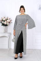 Блузка прямого силуэта с круглым вырезом горловины и втачным рукавом изготовлена из трикотажной ткани. Блузка по переду декорирована печатью. Брюки классические средней посадки в боковых швах наклонные карманы, верхний срез оформлен поясом с эластичной резинкой по бокам. По низу брюк разрезы.