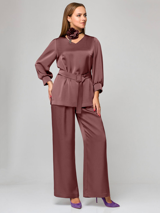 Комплект женский двухпредметный.  Блузка - прямого силуэта с V-образным вырезом горловины. По спинке застежка на 3-петли и пуговицы. В боковых швах разрезы. Рукав втачной со складкой по низу с манжетой. Брюки классического покроя, прямые от бедра. В боковых швах карманы с отрезными бочками. Пояс отрезной со шлевками. Застежка на молнию и петлю с пуговицей. Изделие дополнено съемным поясом из основной ткани на пряжке. Длина блузки 69 см, длина рукава 52 см, длина брюк 106 см. Украшение в комплект не входит.