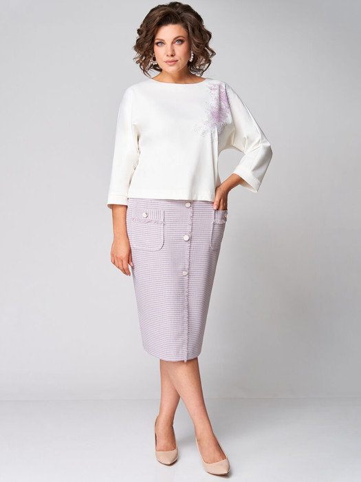 Комплект состоит из туники и юбки. Туника трикотажная прямого силуэта со спущенной линией плеча. По левой части переда декоративная печать. Рукав одношовный укороченный с манжетой по низу. Длина туники см, длина рукава см.Юбка, слегка зауженная к низу, по переду накладные карманы и декоративная отделка с пуговицами. Юбка на подкладке, по верху притачной пояс с резинками по бокам. Застежка в среднем шве заднего полотнища на потайную -молнию с петлей и пуговицей.