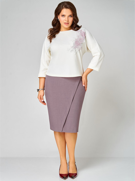 Комплект состоит из туники и юбки. Элегантный костюм не оставит Вас незамеченной и станет Вашей любимой одеждой не только на осенний период, но и в любое время года. Туника трикотажная прямого силуэта со спущенной линией плеча. По левой части переда декоративная печать. Рукав одношовный укороченный с манжетой по низу. Юбка на подкладке слегка заужена к низу, изготовлена из текстильной ткани. По переду частично отлетная правая часть с имитацией запаха. Заднее полотнище юбки со средним швом и разрезом по низу. По верху юбки притачной пояс с резинкой по бокам.