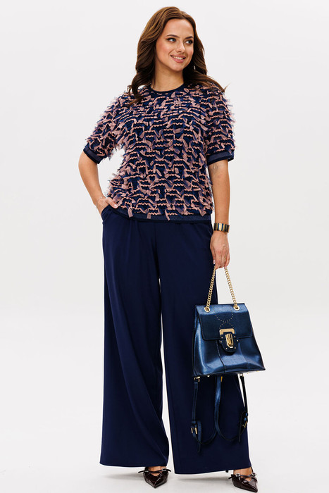 Комплект женский, из разных по фактуре тканей, состоящий из джемпера на трикотажной подкладке и брюк палаццо. Джемпер прямого силуэта, рукав втачной, одношовный. Горловина, низ рукава и низ изделия обработанны притачной трикотажной бейкой. Брюки палаццо, на притачном поясе с резинкой и тесьмой. У брюк - боковые карманы.