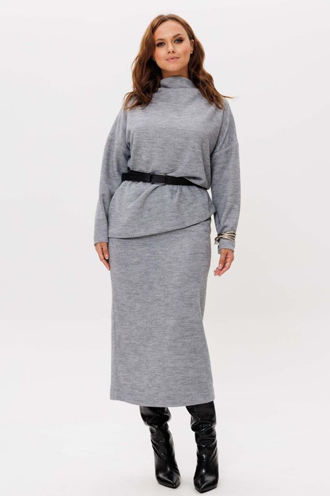 Костюм трикотажный женский состоит из джемпера и юбки нан подкладке. Джемпер прямого силуэта со спущенным втачным рукавом. В боковых швах обработаны разрезы. Горловина - цельнокроенная стойка. Юбка миди. Зауженная к низу. Спинка со средним швом, заканчивающимся разрезом. Талия обработана притачным поясом на резинке.