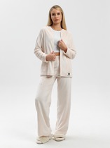 Костюм женский состоит из блузы и брюк. Блуза свободная, А-силуэта, рукав втачной. Спинка со средним швом, заканчивающимся на воздушную петлю-пуговицу. По низу изделия и низу рукава декоративные детали из пайеток. Брюки палаццо, на притачном поясе с резинкой и тесьмой. У брюк - боковые карманы.
