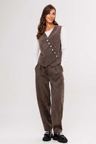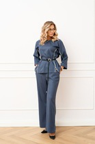 Брюки прямого силуэта, слегка зауженные к низу. Пояс частично на резинке (по бокам), с шлевками для ремня. Застежка на гульфик с молнией и внутренним крючком. По бокам боковые карманы с косым входом. Материал костюма костюмный, средней плотности, с гладкой фактурой. Без подкладки.