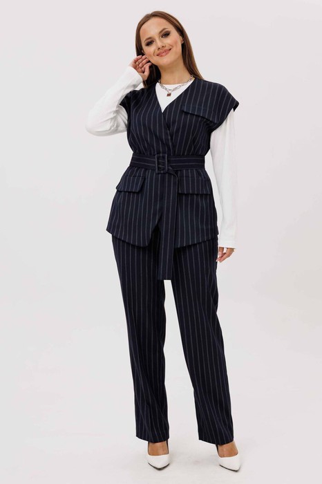 Комплект женский, состоящий из жилета и брюк. Жилет полуприлегающего силуэта, без подкладки. Плечо спущенное.Вырез V - образный, с воротником стойкой. По переду иммитация карманов с клапаном. Центральная застежка на пришивные кнопки. Спинка со средним швом и вытачками. Джемпер без вытачек. Рукава втачные, одношовные, длинные. Ткань в рубчик. Прямой крой. Брюки прямого силуэта, слегка зауженные к низу. Пояс частично на резинке (по бокам), с шлевками для ремня. Застежка на гульфик с молнией и пуговицей. По бокам карманы с косым входом. Материал костюма костюмный, средней плотности, с гладкой фактурой. Без подкладки. Дополняет модель широкий пояс.