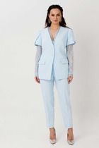 Костюм женский, состоит из жакети и брюк. Жакет полуприлегающего силуэта, с центральной бортовой застежкой на 2 петли-пуговицы. Перед с нагрудными вытачками и карманами в рамку с клапанами. Спинка с талиевыми вытачками, со средним швом, заканчивающимся шлицей. Рукав - двойной из основной и кружевной ткани. Горловина обработана декоративным кружевом. Жакет на подкладке. Брюки женские с высокой посадкой на широком поясе зауженные к низу. По переду прорезные карманы с листочкой, и застёжка молния с гульфиком и откоском.  Пояс по спинке на резинке и застёгивается на прорезную петлю и пуговицу.