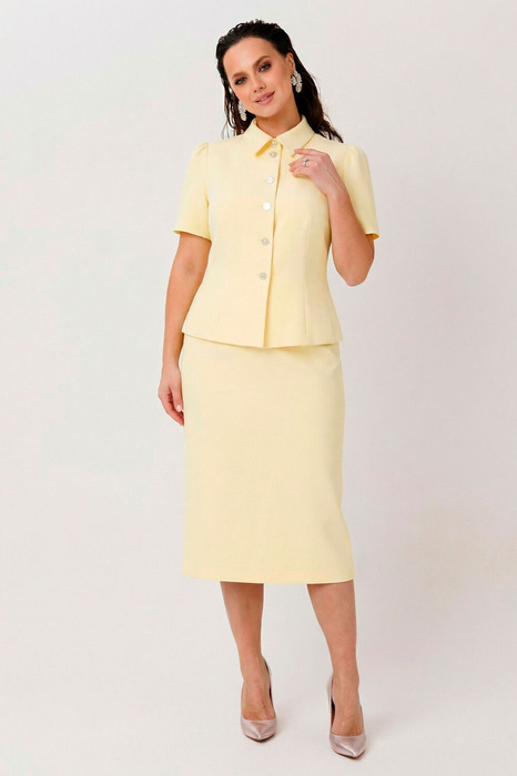 Элегантный женский костюм классического кроя. Комплект состоит из жакета и юбки-карандаш. Жакет полуприлегающего силуэта, спинка со средним швом. По конструкции предусмотрена центральная застежка на 8 пугович. воротник стоячий отложной. Рукава втачные, со сборкой по окату. Юбка длиной миди, слегка зауженная к низу со шлицей. Пояс юбки на обтачке, застежка на тесьму-молнию, пояс частично на резинке по бокам. Жакет и юбка на подкладке.