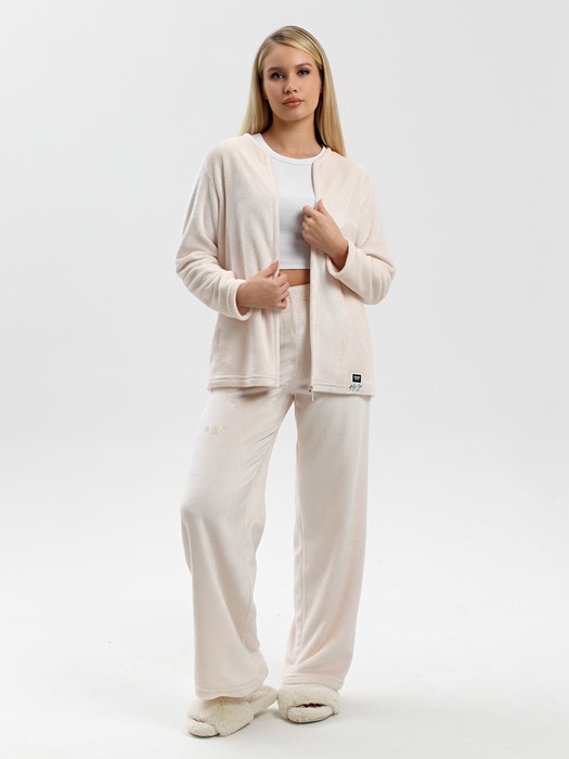 Костюм молодежный из гладкокрашенного тканого полотна «велсофт», состоящий из куртки и брюк. Куртка - прямого силуэта, с длинными втачными рукавами, без воротника с горловиной овальной формы, центральной бортовой застежкой на тесьму «молния». На левой полочке на подгибке, настрочен декоративный элемент.Брюки – длинные, свободные, с карманами в боковых швах и с эластичной тесьмой по талии.