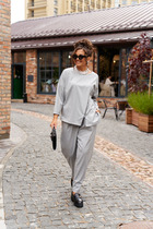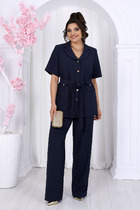 Жакет полуприлегающего силуэта с двухбортной застежкой на три обтяжные из атласной ткани пуговицы и одной потайной. Край борта овальной формы, что придаёт жакету утонченность. По переду обработаны фигурные рельефы из проймы, также имеется горизонтальный подрез,в котором расположены карманы. На правой центральной части полочки - три складки, параллельные подрезу. Дополнительно с левой стороны завязывается атласный бант,что придает нарядность и особый шарм. Одна часть банта крепиться на пуговицу, другая в боковом шве. Спинка со средним швом и вертикальными рельефами из проймы. Воротник пиджачного типа из атласной ткани с пикообразными лацканами. Рукава двухшовные, со шлицей в локтевом шве на одну пуговицу, также обтяжную из атласа. Жакет на подкладке. Брюки классические,со стрелками,с притачным поясом-сзади частично на резинке для удобства и комфортной посадки. На поясе имеются пять шлёвок. На передних половинках присутствуют карманы. Застёжка на молнию и пуговицу. Костюм выполнен из качественной костюмной ткани с отделкой из атласа.