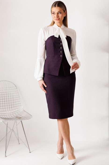 Этот нарядный костюм представляет собой элегантное и утонченное решение для особых случаев. Костюм состоит из корсета и юбки. Топ-корсет прилегающего силуэта с регилином по рельефам по переду и спинке, который обеспечивает дополнительную жёсткость и посадку на фигуре. Застёжка центральная бортовая на 6 петель и пуговиц. Низ переда фигурной заострённой формы, что подчёркивает элегантный силуэт. Модель идеально подходит для создания строгих, утонченных образов и может использоваться как в качестве элемента вечернего наряда, так и для повседневных образов с более нейтральными деталями. Наденьте его с нашей юбкой - это беспроигрышный дуэт, где игривость и строгость подчеркивают друг друга. Юбка прямая, зауженная к низу, сверху на притачном поясе. Застежка на тесьму-молнию в среднем шве, который переходит в шлицу. Костюм на подкладке.