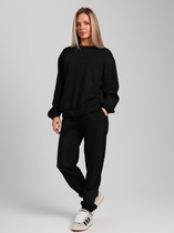 Туника полуприлегающего силуэта . Спинка со средним швом и талиевыми вытачками. По переду выполнены нагрудные вытачки, которые выходят из боковых швов. Низ туники ассиметричной формы. Вырез горловины округлой формы. Брюки прямые, слегка зауженные к колену. На притачном поясе сзади с резинкой. Брюки с карманами. Застежка на тесьму молнию. Костюм декорирован съемной брошью.