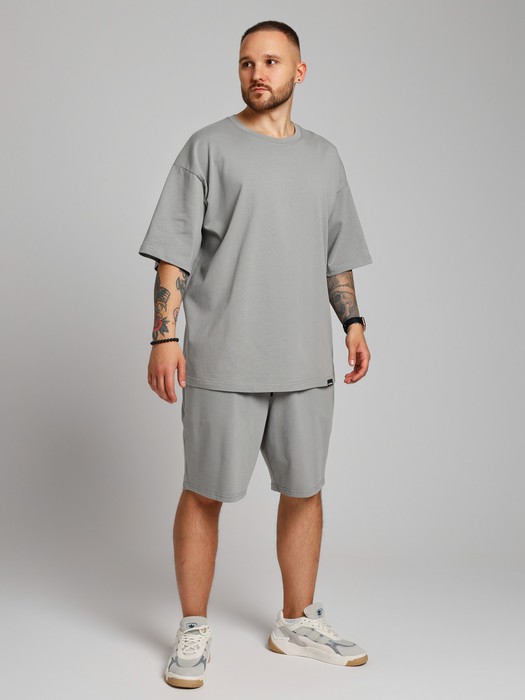 Костюм мужской из плотного гладкокрашеного трикотажного полотна "кулирка", состоящий из футболки и шорт. Футболка - свободного покроя, с удлиненными плечевым и швами, короткими втачными рукавами и горловиной овальной формы, обработанной втачной планкой. В нижней части переда слева настрочен декоративный элемент прямоугольной формы. По горловине проложена отделочная строчка. Шорты - классического покроя, на притачном поясе с эластичной тесьмой внутри и карманами в боковых швах. Для регулирования степени прилегания шорт по талии в пояс вставлен шнурок, продетый через две петли в центре пояса.