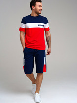 Костюм мужской, состоящий из футболки и шорт. Футболка - свободного покроя, короткими втачными рукавами и горловиной овальной формы, обработанной втачной планкой. По шву втачивания планки настрочена двойная отделочная строчка. Шорты - удлиненные, с карманами в боковых швах, на притачном поясе с эластичной тесьмой внутри.