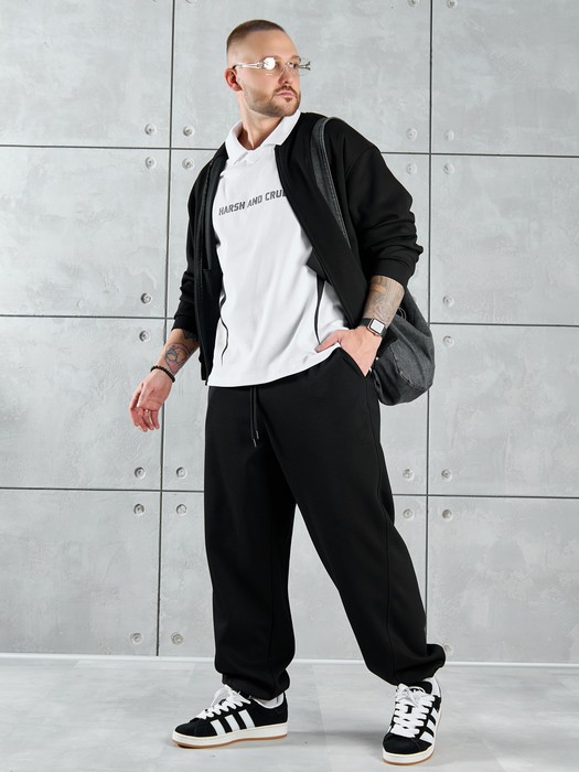 Костюм мужской из трикотажного полотна "лининг", состоящий из бомбера и брюк. Бомбер - с длиннми втачными рукавами с притачными манжетами, прорезными карманами с листочками на полочках, центральной бортовой застежкой на тесьму "молния", втачным воротником-стойкой с закругленными концами и притачным поясом по низу. По шву притачивания пояса и проймам настрочены отделочные строчки. Брюки - свободного покроя, со смещенными к центрам передних половин боковыми швами, карманами в боковых швах и притачным поясом с эластичной тесьмой внутри. Нижние срезы обработаны подгибкой с эластичной тесьмой. Для регулирования степени прилегания изделия по талии предусмотрен шнурок, вставленный через две обметанные петли в центре пояса спереди.