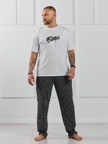 Костюм мужской из трикотажного полотна "кулирка" в комбинации двух видов: гладкокрашенного красного цвета и с набивным тематическим рисунком на сером фоне , состоящий из футболки и брюк. Футболка - классического силуэта, свободного покроя, с приспущенным плечом, с втачными рукавами длиной до локтя, горловиной овальной формы, обработанной втачной планкой и принтом в центре переда. По шву втачивания планки настрочена декоративная (5-ниточная) отделочная строчка нитками контрастного цвета Подгибка низа рукавов и изделия так же выполнена с применением декоративной отделочной строчки. Брюки выполнены из полотна с набивным тематическим рисунком, длинные, умеренной ширины, прямые, на притачном поясе с эластичной тесьмй внутри и карманами в боковых швах.
