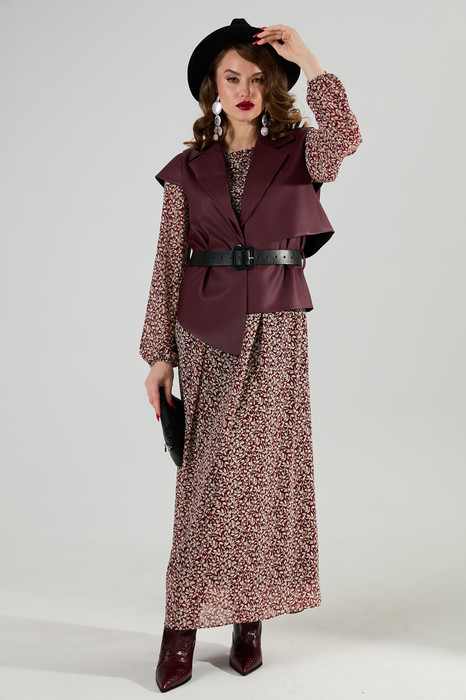 Костюм двухпредметный: состоит из платья и жилета. Платье макси прямого силуэта с V-образным вырезом, отрезное по линии талии. Горловине с имитацией чокера, застёжка на петлю и декоративную пуговицу. Рукав немного приспущен, по низу собран на манжет с петлей и пуговицей. Изделие на подкладке. Жилет из экокожи прямого силуэта с воротником пиджачного типа. По правой пройме переда расположена фигурная  деталь  "крылышко". Спинка со средним швом. По низу правого переда и низу правой спинки фигурная деталь. По левой части переда и левой части спинки отлетная кокетка. Изделие идёт в комплекте с ремнем из экокожи.