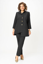 Костюм двухпредметный: состоит из блуза и брюк. Блуза прямого кроя с центральной застёжкой на петли и пуговицы. Вырез горловины глубокий округлый. Линия плеча приспущена. На рукавах изделия заложена декоративная сборка с регулируемыми завязками. В комплект к изделию идёт узкий пояс из основной ткани с авторским украшением ручной работы. Брюки свободного кроя, верхний срез представлен широкой резинкой, с карманами.