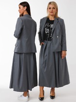 Костюм двухпредметный: состоит из джемпера-кейпа и платья. Укороченный джемпер-кейп с округлой горловиной и фигурным лифом. Рукав втачной широкий , от линии локтя до запястья есть дополнительное отверстие для рук. Платье длиной миди отрезное по линии талии приталенного силуэта. Нижняя часть платья имеет небольшое расклешение.Прилегание по переду создано за счет нагрудных вытачек, переведенных в боковой шов, и талиевых вытачек. На спинке талиевые вытачки и средний шов. Застежка платья на потайную молнию в среднем шве спинки. Плечевой пояс оформлен кокетками по переду и спинке, напоминающими по форме рукав реглан. Плечо немного приспущено.