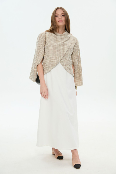 Костюм двухпредметный: состоит из джемпера-кейпа и платья. Укороченный джемпер-кейп с округлой горловиной и фигурным лифом. Рукав втачной широкий , от линии локтя до запястья есть дополнительное отверстие для рук. Платье длиной миди отрезное по линии талии приталенного силуэта. Нижняя часть платья имеет небольшое расклешение.Прилегание по переду создано за счет нагрудных вытачек, переведенных в боковой шов, и талиевых вытачек. На спинке талиевые вытачки и средний шов. Застежка платья на потайную молнию в среднем шве спинки. Плечевой пояс оформлен кокетками по переду и спинке, напоминающими по форме рукав реглан. Плечо немного приспущено.