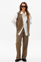 Костюм двухпредметный: состоит из джемпера и брюк. Джемпер из комбинированной ткани  свободного силуэта с округлой горловиной. Рукав с передними и задними швами. Верхняя и нижняя часть рукава образуют между собой разрез. Карманы в боковых швах. Брюки прямого силуэта большого объёма. Линия талии занижена. Пояс притачной. На передних половинках брюк карманы с отрезным бочком. На задних половинках брюк отрезная кокетка и накладные карманы.