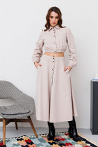 Костюм двухпредметный: состоит из рубашки - кропа и юбки. Укороченная рубашка из денима. Модель свободного кроя собрана на резинку по нижнему краю. Отложной воротник. Изделие застегивается на кнопки. Юбка - солнце длиной миди из облегчённого денима с узким поясом. В боковых швах расположены карманы. Застежка на кнопки с цельнокроеной планкой. Длина около 94 см. Изделие без подкладки.