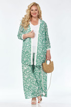 Костюм двухпредметный: состоит из блузы и юбки. Блуза прямого силуэта свободного кроя с втачным рукавом со спущенной проймой. По горловине переда планка с запахом. Воротник с цельнокроенной стойкой. По низу переда имеется нашивка из экокожи. Боковые швы с разрезами. Юбка длиной миди прямая на резинке. Разрез по переду. Изделие без подкладки.
