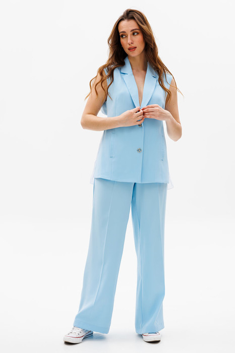 Костюм двухпредметный: состоит из жилета и брюк. Жилет из костюмной ткани полуприлегающего силуэта. Застежка центральная на петли и  пуговицы. Перед с талевыми вытачками, уходящими в линию низа. Спинка выполнена из отделочной ткани. В верхней части спинки расположена фигурная отлетная кокетка. На линии талии в боковых швах закреплен завязывающийся пояс. Брюки свободного кроя, верхний срез представлен широкой резинкой, с карманами