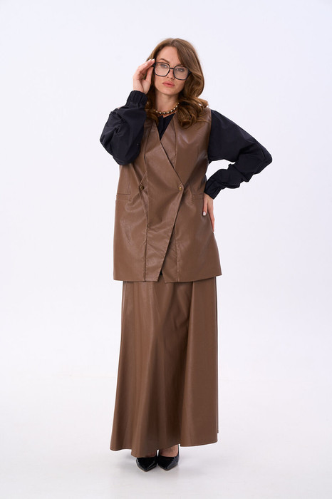 Костюм двухпредметный: состоит из жилета и юбки. Жилет двубортный прямого кроя объёма оверсайз. Застёжка фигурная на кнопки. Карманы - листочки. Роскошная юбка - солнце миди с узким поясом. В боковых швах расположены карманы. Застёжка на петли и пуговицы с цельнокроеной планкой.Длина около 94 см. Изделие без подкладки.