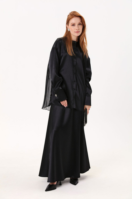 Костюм двухпредметный: состоит из блузы и юбки. Блуза свободного кроя с округлым вырезом горловины. Центральная застёжка на петли и пуговицы. Рукав втачной одношовный спущенный с притачной манжетой на петлю и пуговицу. Спинка с отрезной кокеткой, нижняя часть спинки декорирована плиссированным шифоном. Низ изделия фигурный. Боковые швы с разрезами. Юбка - солнце макси с узким поясом. В боковых швах расположены карманы. Застёжка на петлю и пуговицу и молнию по спинке.