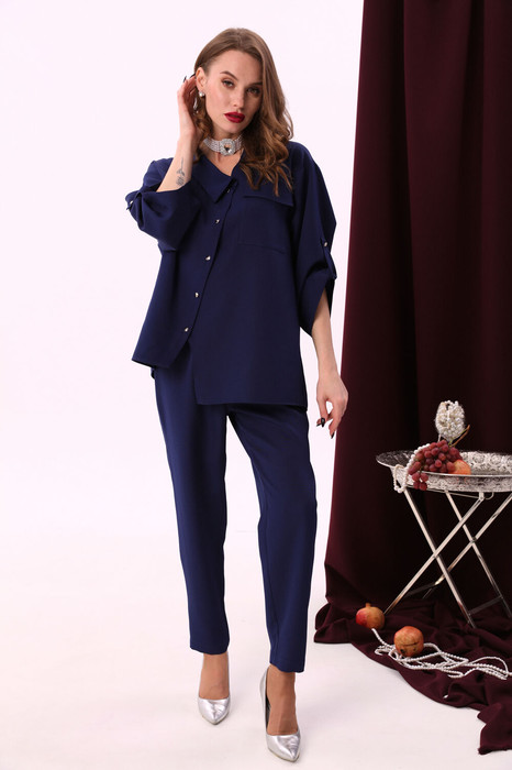 Костюм двухпредметный: состоит из жакета и брюк. Жакет рубашечного типа прямого силуэта с асимметричным низом. Рукав втачной со спущенной линией плеча, фиксируется на пату. Застежка центральная на петли и пуговицы, смещённая по косой. На левой полочке накладной карман с клапаном. Воротник отложной на стойке до половины спинки. Комфортные брюки свободного кроя со складками и карманами по переду, зауженные к низу. Пояс притачной со шлёвками и центральной застёжкой на гульфик и молнию. По спинке изделия накладные карманы и резинка.