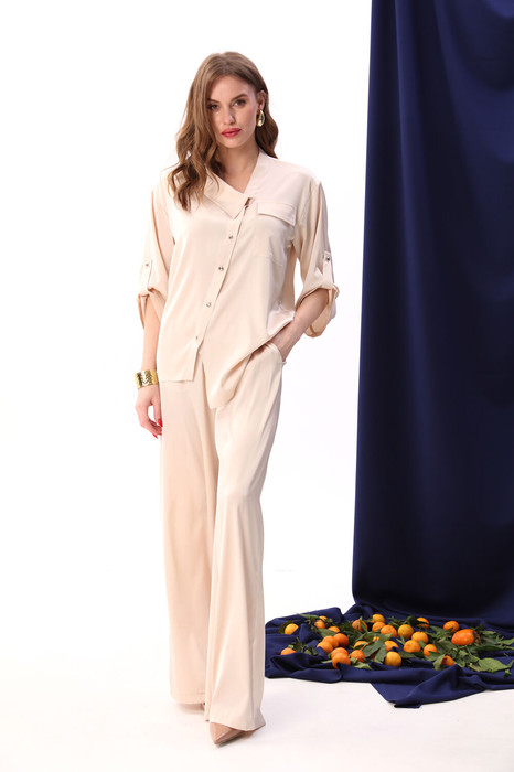 Костюм двухпредметный: состоит из жакета и брюк. Жакет рубашечного типа прямого силуэта с асимметричным низом. Рукав втачной со спущенной линией плеча, фиксируется на пату. Застежка центральная на петли и пуговицы, смещённая по косой. На левой полочке накладной карман с клапаном. Воротник отложной на стойке до половины спинки. Брюки свободного кроя из гладкой ткани сочетают элегантность и комфорт. Широкая резинка на поясе и наличие функциональных карманов подчеркивают удобство модели.
