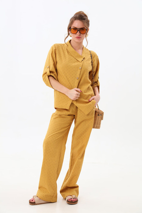 Костюм двухпредметный: состоит из жакета и брюк.Жакет рубашечного типа прямого силуэта с асимметричным низом. Рукав втачной со спущенной линией плеча, фиксируется на пату. Застежка центральная на петли и пуговицы, смещённая по косой. На левой полочке накладной карман с клапаном. Воротник отложной на стойке до половины спинки. Брюки свободного кроя, верхний срез представлен широкой резинкой, с карманами.