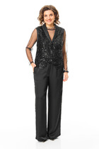 Костюм двухпредметный: состоит из блузы и брюк. Блуза свободного прямого кроя из комбинированной ткани. Воротник стояче-отложной рубашечного типа, застёжка центральная на петли и пуговицы. Рукав втачной одношовный с притачной манжетой на петлю и пуговицу. Спинка с отрезной кокеткой, нижняя часть спинки декорирована трикотажным гофре. Низ изделия по переду ассиметричный. Брюки свободного кроя, верхний срез представлен широкой резинкой, с карманами.