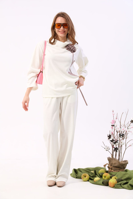 Костюм двухпредметный: состоит из джемпера и брюк. Джемпер-кейп прямого свободного силуэта. Горловина с цельнокроеным воротником-стойкой. Рукав втачной широкий, от линии локтя до запястья есть дополнительное отверстие для рук. Декорирован цветком из контрастной ткани. Брюки свободного кроя, верхний срез представлен широкой резинкой, с карманами.