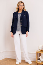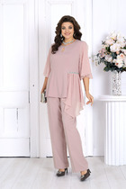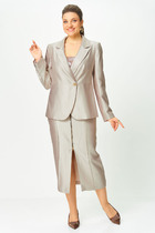 Костюм комбинированный двухпредметный: состоит из жакета и юбки. Жакет рубашечного типа прямого силуэта с асимметричным низом. Рукав втачной со спущенной линией плеча, фиксируется на пату. Застежка центральная на петли и пуговицы, смещённая по косой. На левой полочке накладной карман с клапаном. Воротник отложной на стойке до половины спинки. Юбка - солнце макси с узким поясом. В боковых швах расположены карманы. Застёжка на петлю и пуговицу и молнию по спинке.